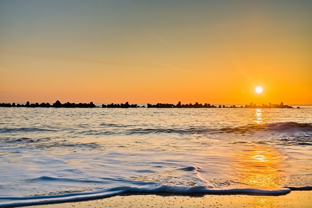 Photo by <a href="https://www.sprayedout.com/">Luke Lawreszuk - Sprayedout.com</a> (CC BY 4.0) via <a href="https://www.sprayedout.com/ishihama-beach-sunrise-over-the-ocean/">Beach Sunrise Over the Ocean</a>.