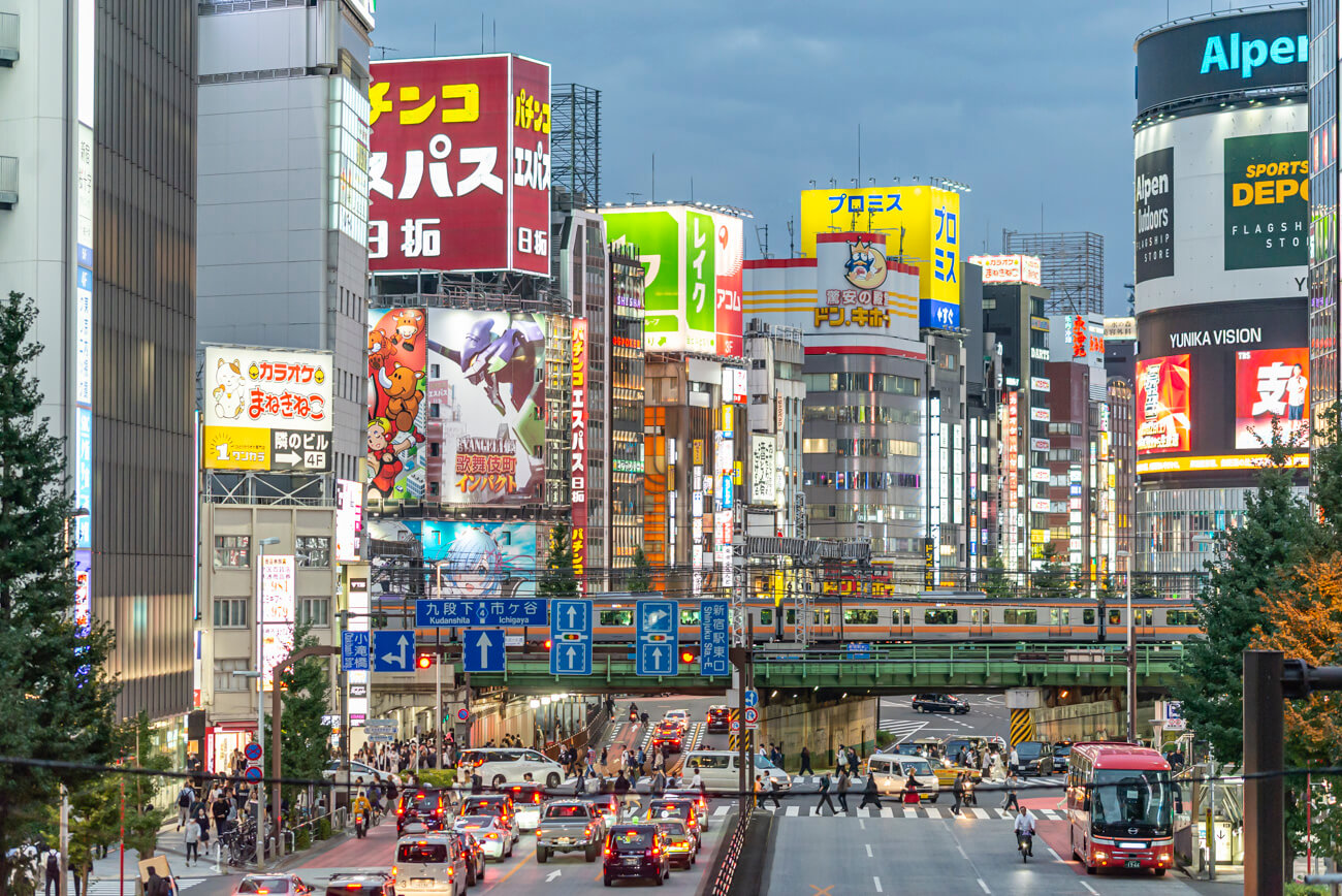 Evening view of Shinjuku, Tokyo, with trains, traffic and neon signs captured at dusk near [...]